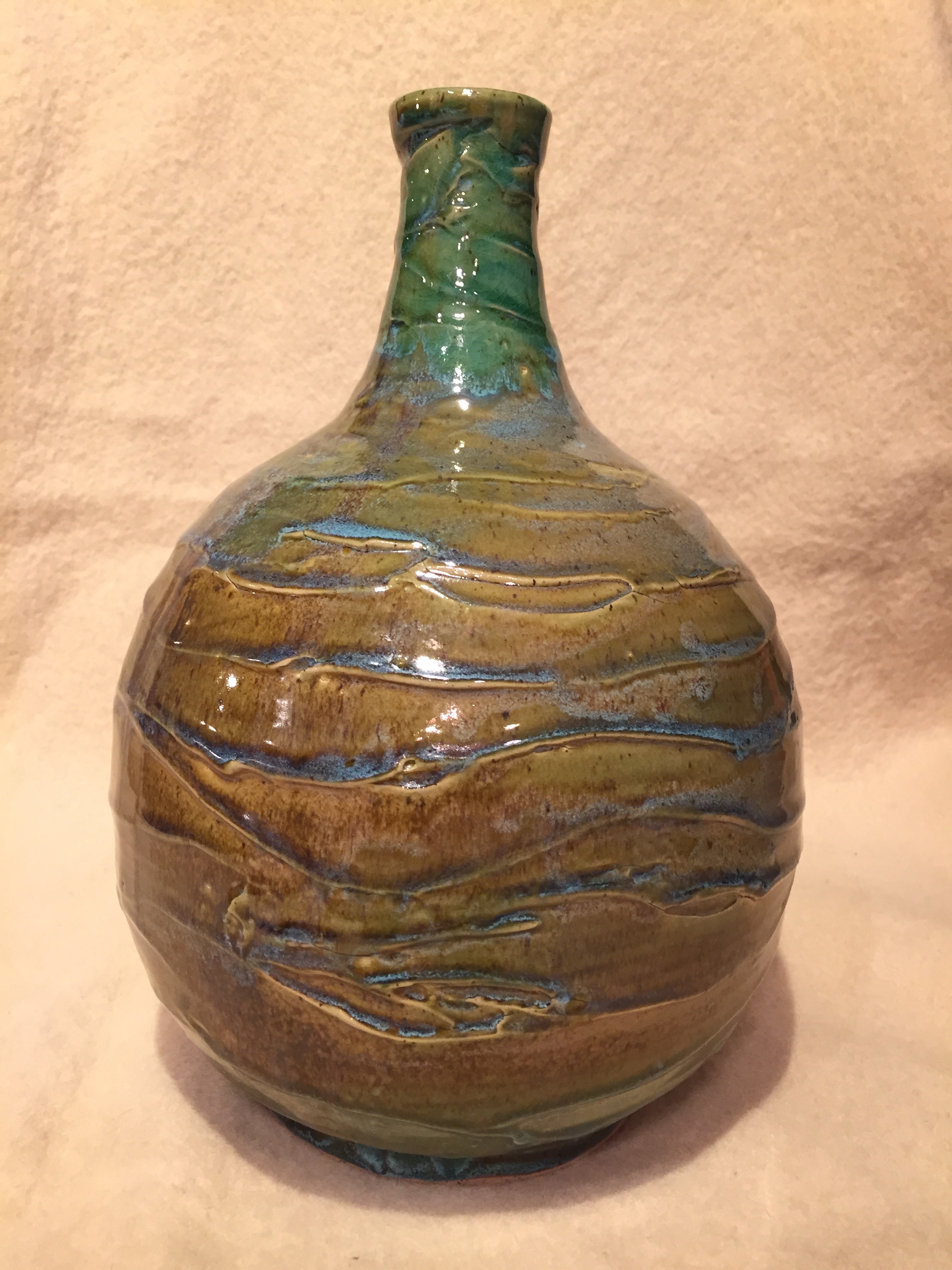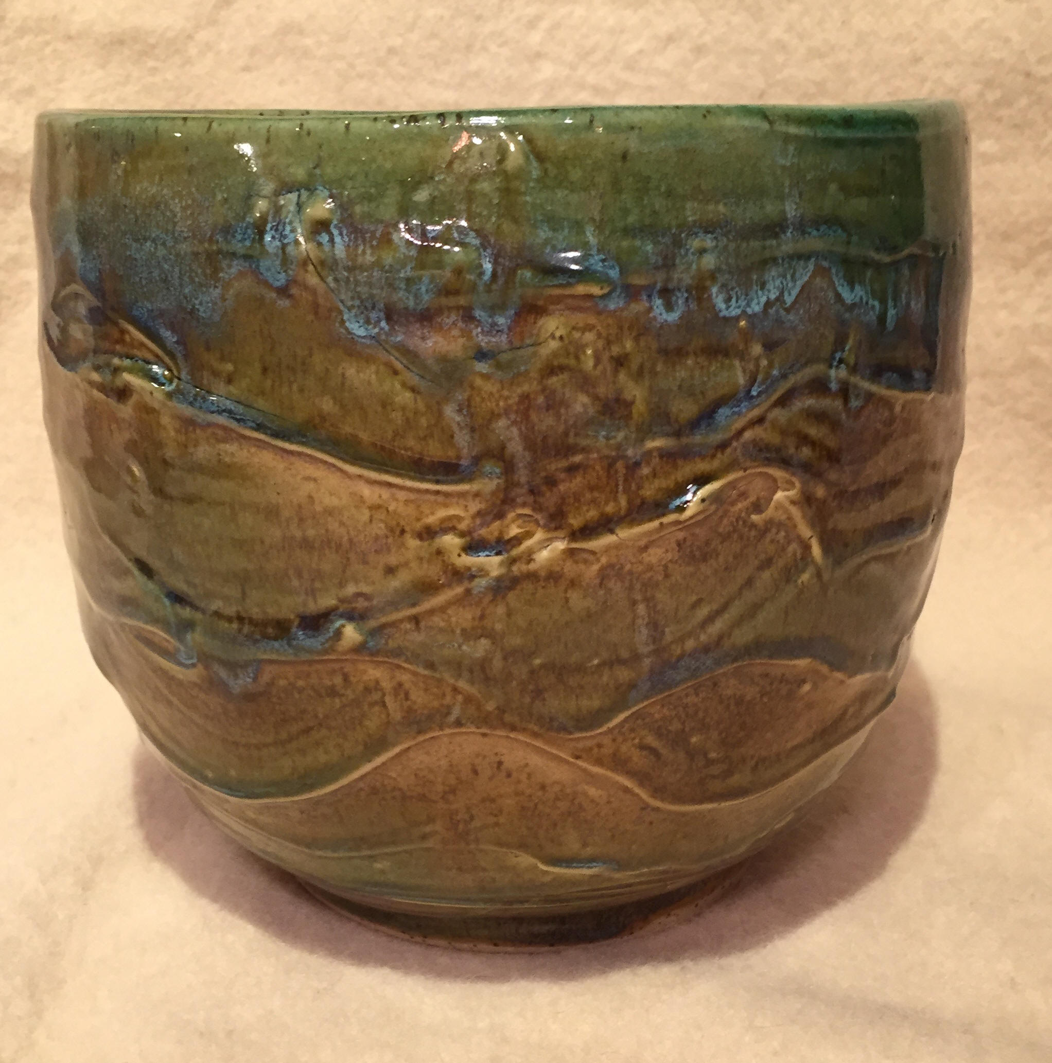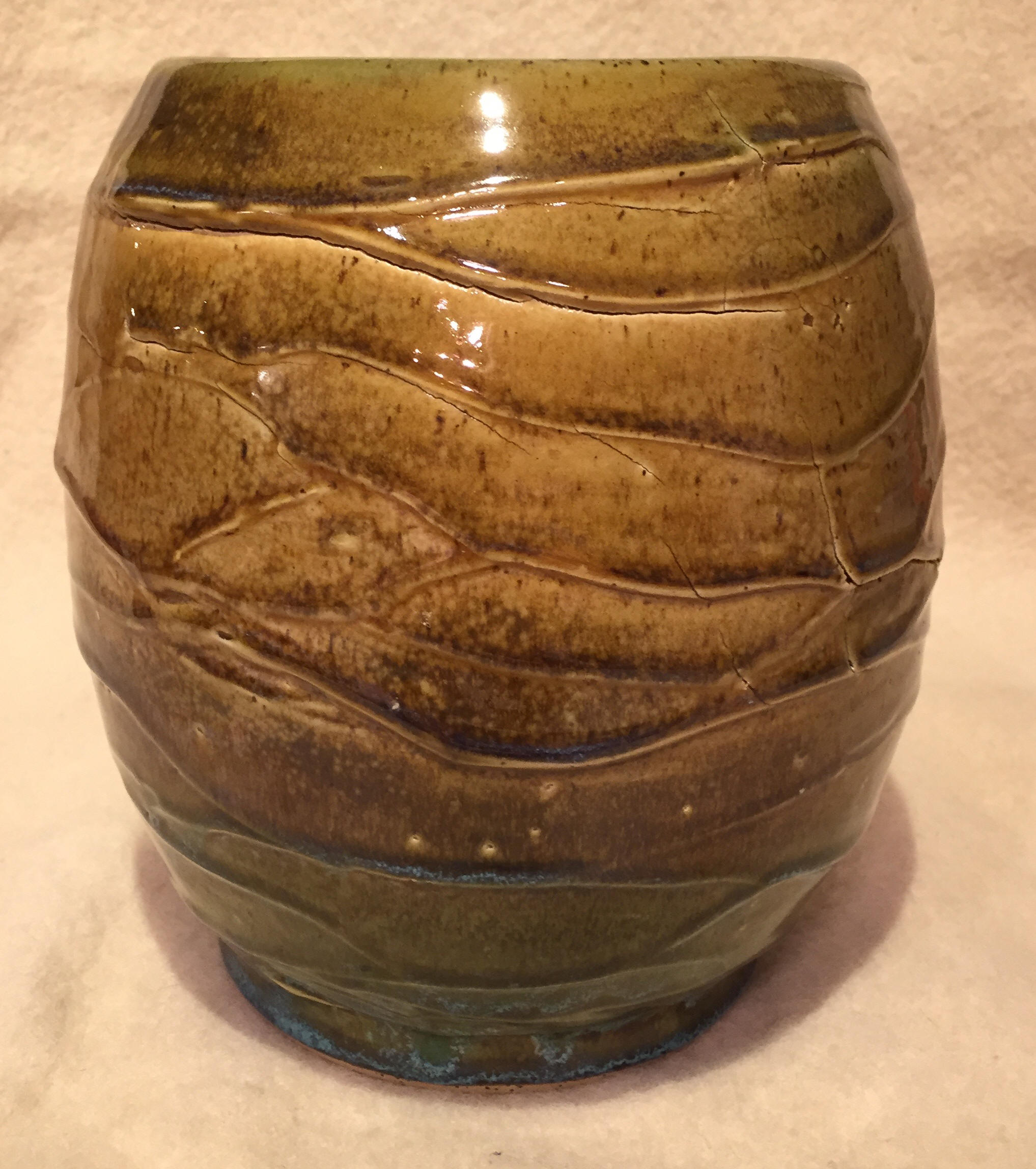 "Frosting" Style Stoneware. With the frosting items, I create the piece in the normal manner, but before it is dry, I apply a coating of clay slip and then I 'frost' it as you would the frosting on a cake. The true beauty of the frosting is achieved by spraying the green glaze over the brown in a particular manner. |