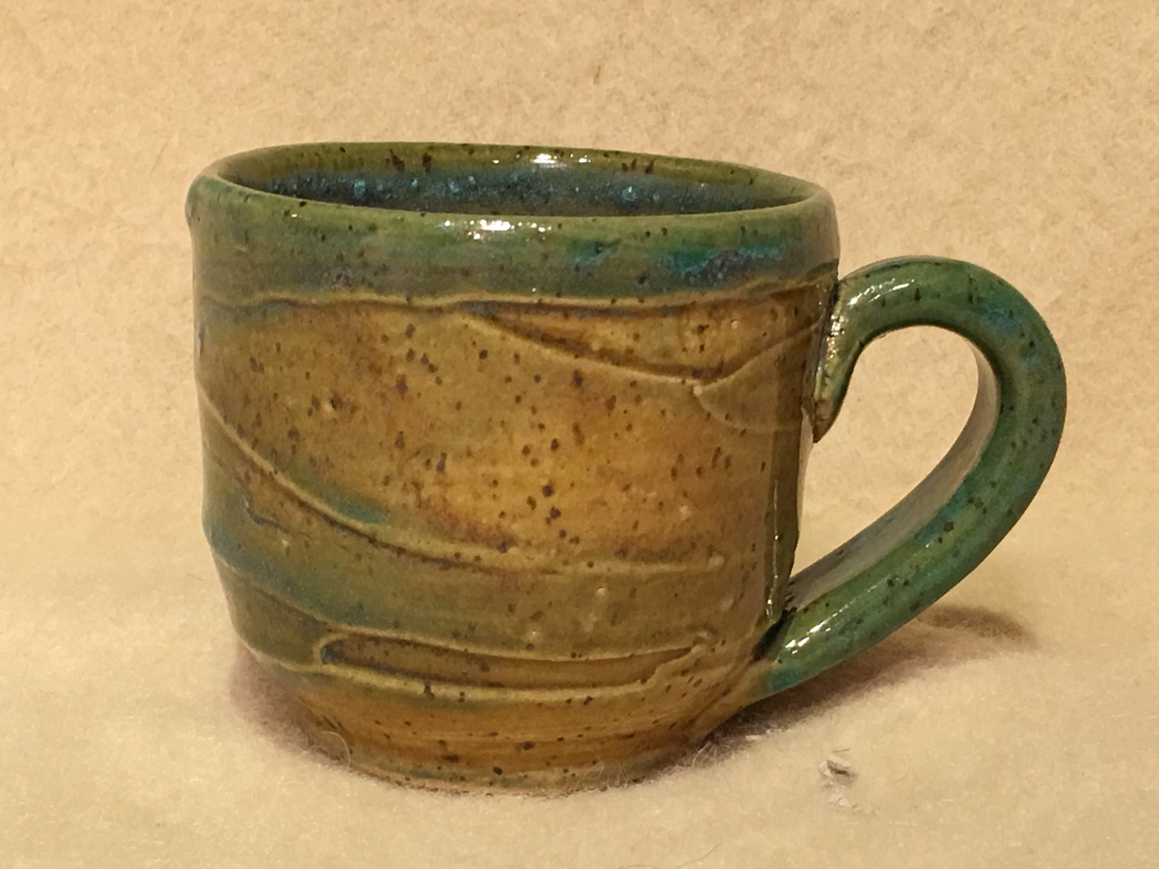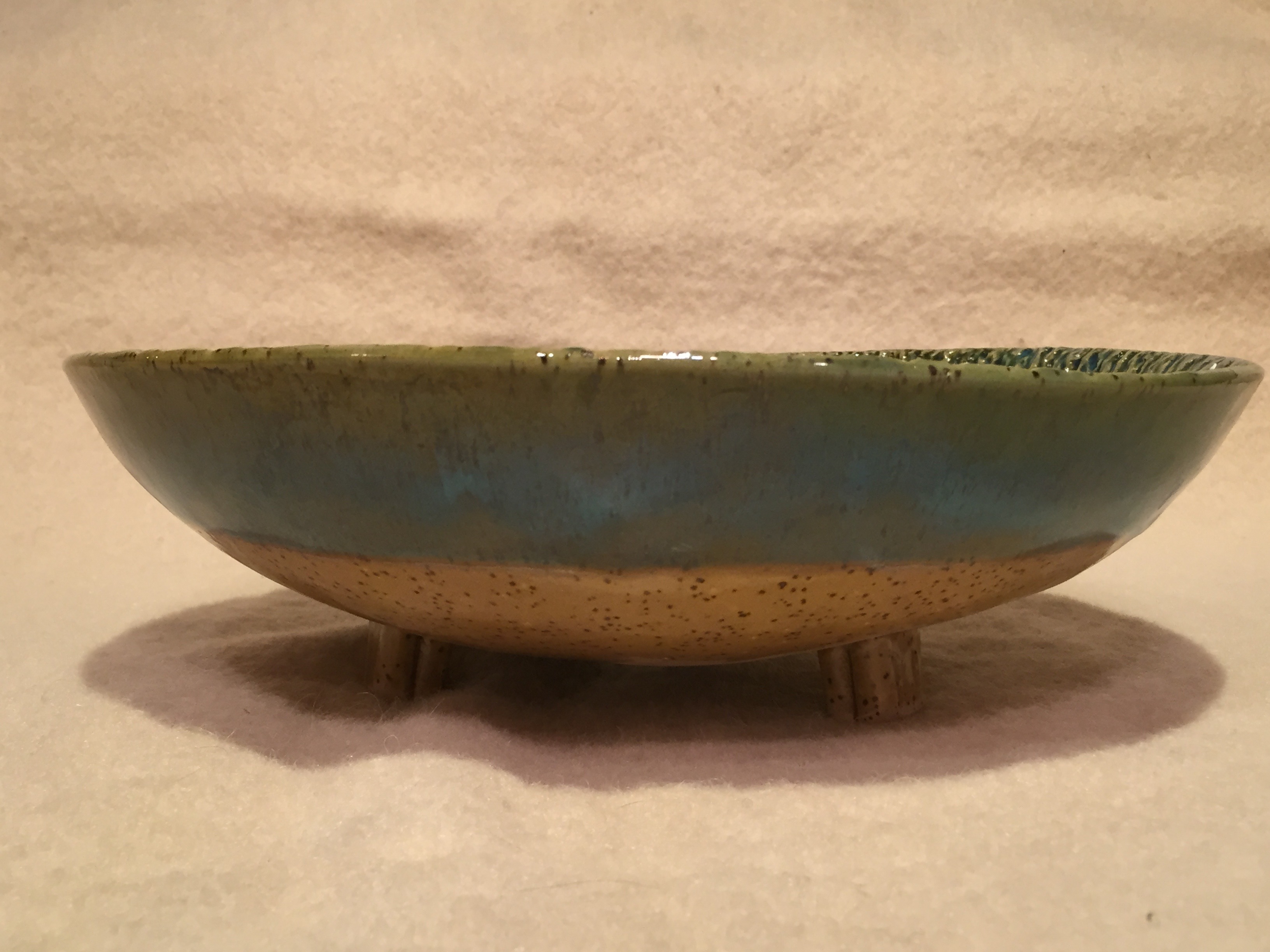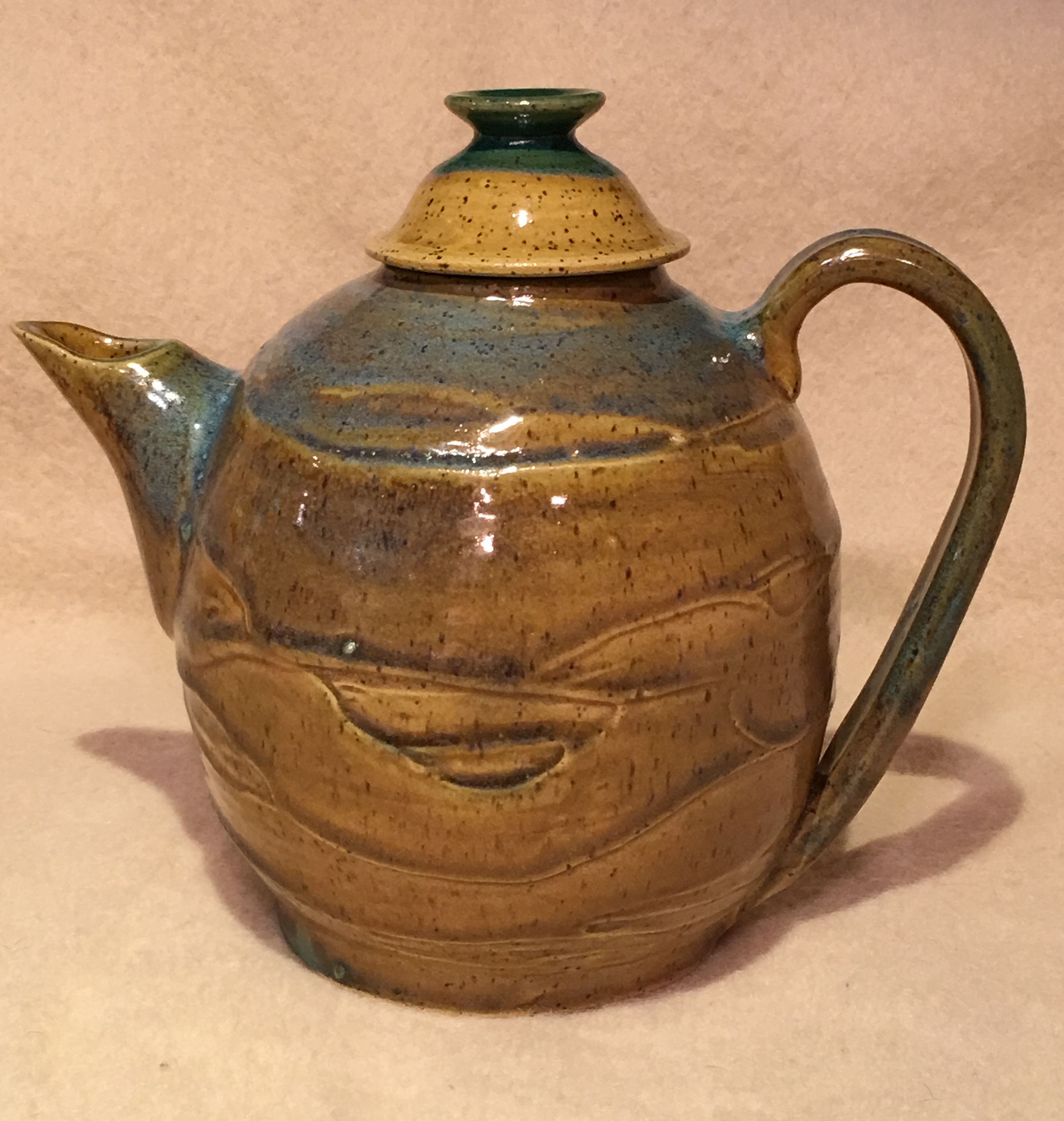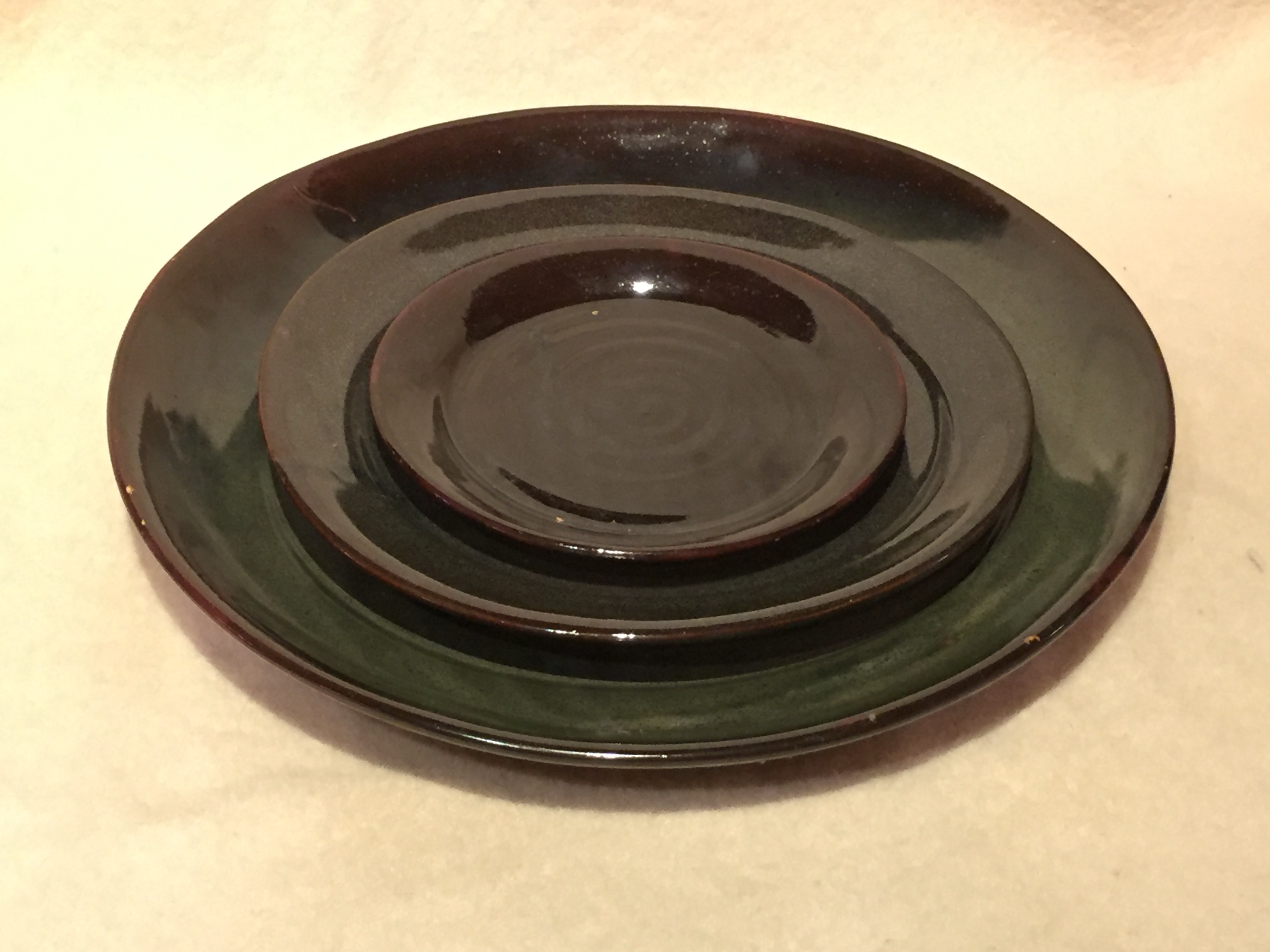 "Frosting" Style Stoneware. With the frosting items, I create the piece in the normal manner, but before it is dry, I apply a coating of clay slip and then I 'frost' it as you would the frosting on a cake. The true beauty of the frosting is achieved by spraying the green glaze over the brown in a particular manner. |